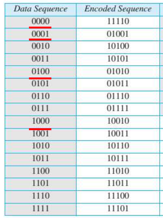 Block coding Block coding์ ๋๊ธฐํ๋ ์ค๋ฅ ๊ฒ์ถ์ ํ๋ ๊ฒ์ ํนํ๋ ๋ฐฉ๋ฒ์ด๋ค. ๋๊ธฐํ๋ ์ค๋ฅ ๊ฒ์ถ์ ์ํด line coding๊ณผ ๋ค๋ฅด๊ฒ ์ฌ๋ถ์(redundancy) ์ ๋ณด๋ฅผ ๋ ํฌํจํ๋ค. ๋น์ฐํ ์์์ด ๋ ๋ค ์ ๋ฐ์ ์๋ค