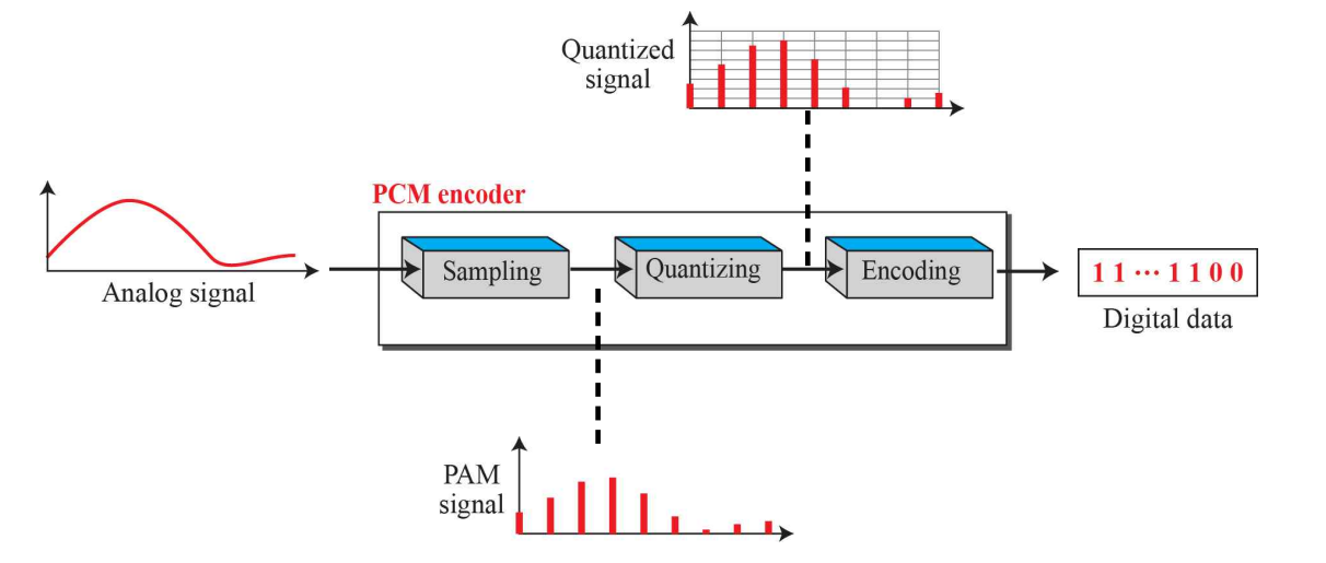 ์ด๋ฌํ ๋ณํ์ ๊ณผ์ ์ PCM encoding์ด๋ผ๊ณ ํ๋๋ฐ ์ฌ๊ธฐ์๋ 3 ๊ฐ์ง ๊ณผ์ ์ ๋ฐ๋ฅธ๋ค.