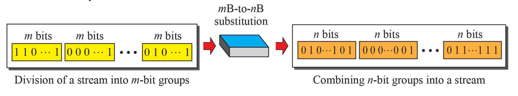 ๊ธฐ๋ณธ์ ์ผ๋ก m๊ฐ์ ๋นํธ์์ n๊ฐ์ ๋นํธ๋ก ๋ณํํจ๊ณผ ๋์์ n์ด m๋ณด๋ค ํด ๊ฒฝ์ฐ์ mB/nB encoding์ด๋ผ๊ณ ๋ถ๋ฅธ๋ค.
