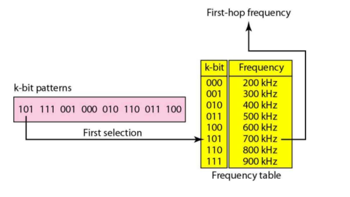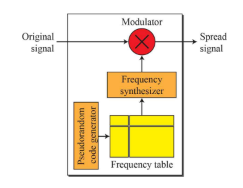 FHSS๋ ๊ฐ ๋ฐ์ดํฐ๋ฅผ ์๋ก ๋ค๋ฅธ ์ฃผํ์์ ๋์์์ผ์ ๋ณด๋ด๋ ๋ฐฉ๋ฒ์ด๋ค. ์ฆ, ๊ฐ ๋ฐ์ดํฐ ๋นํธ๋ง๋ค ๋์๋๋ ์ฃผํ์ ํ ์ด๋ธ์ ๋ง๋ค๊ณ , ์ฌ๊ธฐ์ ๋ง์ถ์ด ๋ฐ์ดํฐ๋ฅผ ์ก์ ํ๋ค. ์ด๋ฅผ ์ํด ์ก์ ์์ ์์ ์๊ฐ ๋๊ธฐํ๋์ด ๊ฐ์ ์ฃผํ์ ํ ์ด๋ธ์ ์ง๋ ์ผ ํ๋ค.