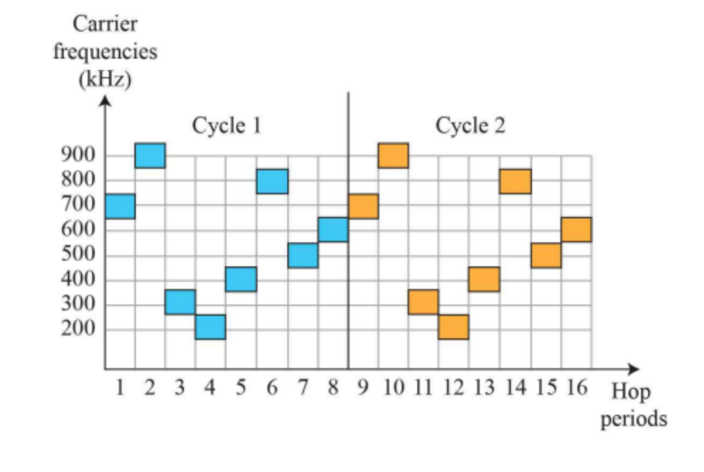 FHSS๋ ๊ฐ ๋ฐ์ดํฐ๋ฅผ ์๋ก ๋ค๋ฅธ ์ฃผํ์์ ๋์์์ผ์ ๋ณด๋ด๋ ๋ฐฉ๋ฒ์ด๋ค. ์ฆ, ๊ฐ ๋ฐ์ดํฐ ๋นํธ๋ง๋ค ๋์๋๋ ์ฃผํ์ ํ ์ด๋ธ์ ๋ง๋ค๊ณ , ์ฌ๊ธฐ์ ๋ง์ถ์ด ๋ฐ์ดํฐ๋ฅผ ์ก์ ํ๋ค. ์ด๋ฅผ ์ํด ์ก์ ์์ ์์ ์๊ฐ ๋๊ธฐํ๋์ด ๊ฐ์ ์ฃผํ์ ํ ์ด๋ธ์ ์ง๋ ์ผ ํ๋ค.