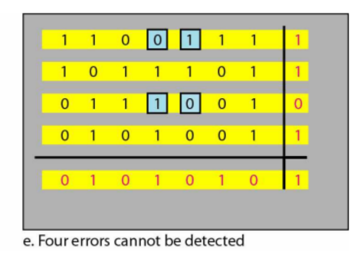 ๋จ, ์๋์ ๊ฐ์ด ๊ฐ์ ํ๊ณผ ๊ฐ์ ์ด์ 2๊ฐ์ฉ ์ค๋ฅ๊ฐ ๋๋ค๋ฉด, ์๋ฌ๋ฅผ ๊ฐ์งํ ์ ์๋ค. ๋ฐ๋ผ์ ์ด Two-dimensional Parity Check๋ ์์ ํ๋ค๊ณ ๋ ํ ์ ์๋ค.