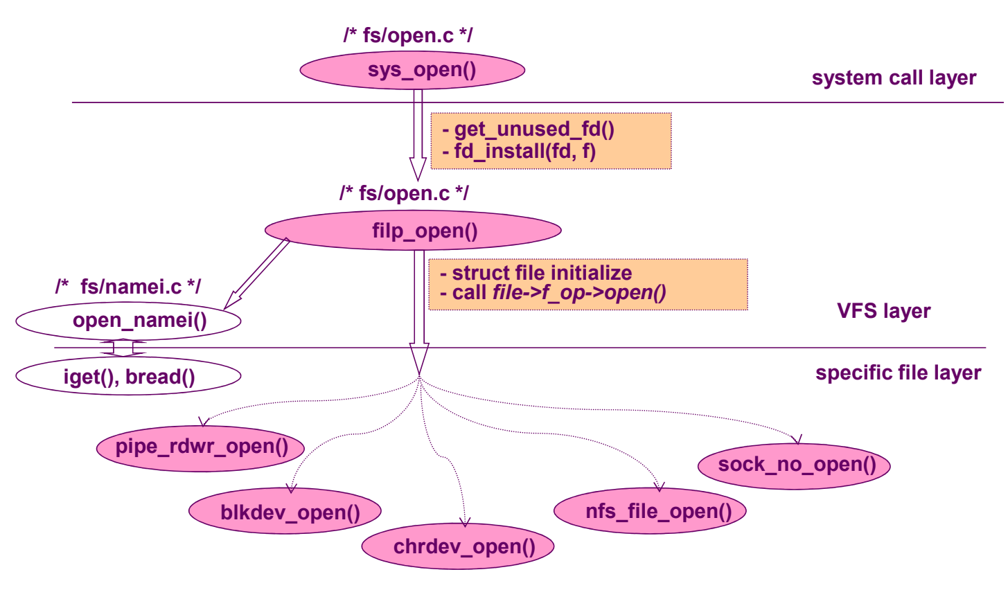 ์ ๊ทธ๋ฆผ๊ณผ ๊ฐ์ด ํ์ผ ์์คํ , ํน์ ์ฅ์น์ ๋ฐ๋ผ ๊ฐ์ ์ข ๋ฅ์ _open_ํจ์์ด๋๋ผ๋ ๋ค๋ฅธ ๋์์ ํด์ผ ํ๋ ๊ฒฝ์ฐ๊ฐ ์๊ธด๋ค.