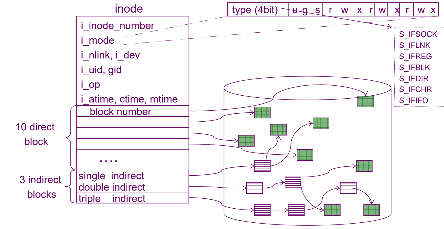 inode๋ ํน์ ํ ํ์ผ์ ๋ํ ์ฃผ์ ์ ๋ณด๋ฅผ ๊ฐ์ง๊ณ ์๋ ์ ์ด ๊ตฌ์กฐ๋ผ๊ณ ํ๋ค. ์ฌ๊ธฐ์๋ ์ง/๊ฐ์ ์ ์ผ๋ก ์ฐ๊ฒฐ๋์ด ์๋ ํ์ผ๋ค์ ๊ฐ์์ธ Link Count ๋ฑ์ ์ ๋ณด๊ฐ ๋ค์ด๊ฐ๋ค๊ณ ํ์๋ค. ๋ํ unix์์์ inode๊ฐ ํ์ผ์ ๋ํ ์ ์ด ์ ๋ณด๋ฅผ ๊ฐ์ง๊ณ ์๋ FCB์ ๋์๋๋ค๋ ๊ฒ๋ ๊ธฐ์ตํด ๋ณด์.