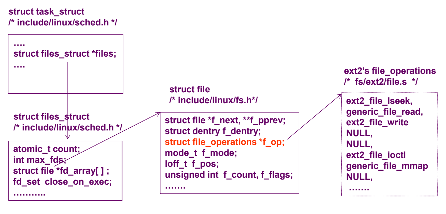 ์์ ๊ฐ์ด ์ฅ์น๋ ํ์ผ ์์คํ ์ ๋ฐ๋ผ openํจ์๋ ์ฌ๋ฌ File Operation ํ ์ด๋ธ์ ๋ฐ๋ผ ๋์ํ๋ค.