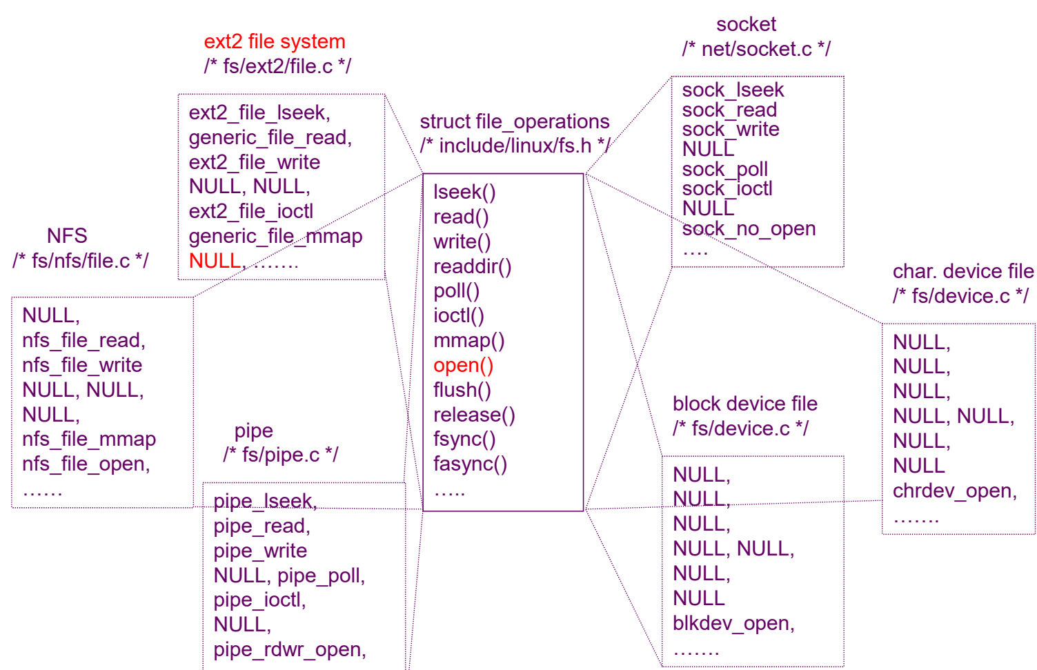 ์์ ๊ฐ์ด ์ฅ์น๋ ํ์ผ ์์คํ ์ ๋ฐ๋ผ openํจ์๋ ์ฌ๋ฌ File Operation ํ ์ด๋ธ์ ๋ฐ๋ผ ๋์ํ๋ค.