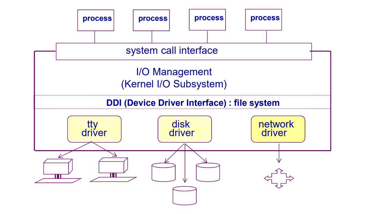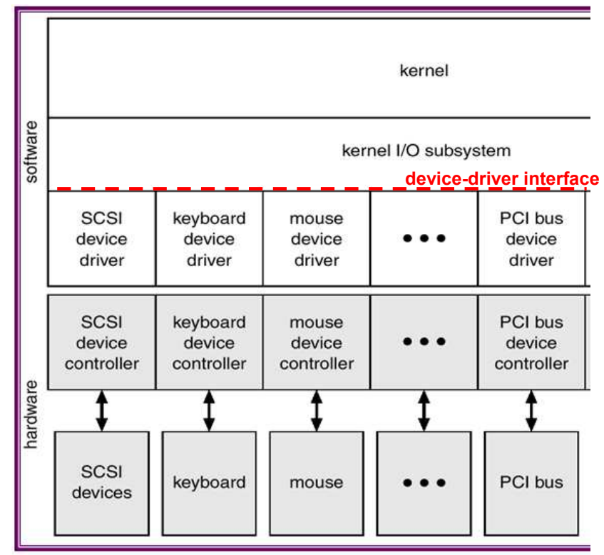 device driver๊ฐ ์ฌ๋ฌ ๊ฐ์ง์ด๋๋ผ๋ ์ด์์ฒด์ ์ ๋ง๋ device-driver interface๋ฅผ ์์ฑํ๋ค๋ฉด ๋ฌธ์ ์์ ๊ฒ์ด๋ค.