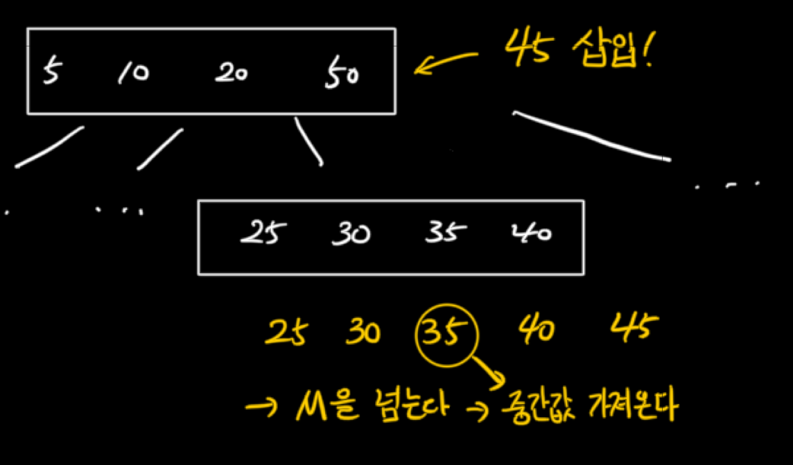 - ์ดํ๋ฆฌ๊ฐ M-1๊ฐ์ ํค๋ฅผ ๊ฐ์ง๊ณ ์์ผ๋ฉด, M-1๊ฐ์ ํค์ ์ ํค ์ค์์ ์ค๊ฐ ๊ฐ์ด ๋๋ ํค๋ฅผ ๋ถ๋ชจ๋ก ์ฌ๋ ค๋ณด๋ด๊ณ , ๋จ์ M-1๊ฐ์ ํค๋ฅผ 1/2์ฉ ๋๋์ด ๊ฐ๊ฐ ๋ณ๋์ ๋ ธ๋์ ์ ์ฅํ๋ค.