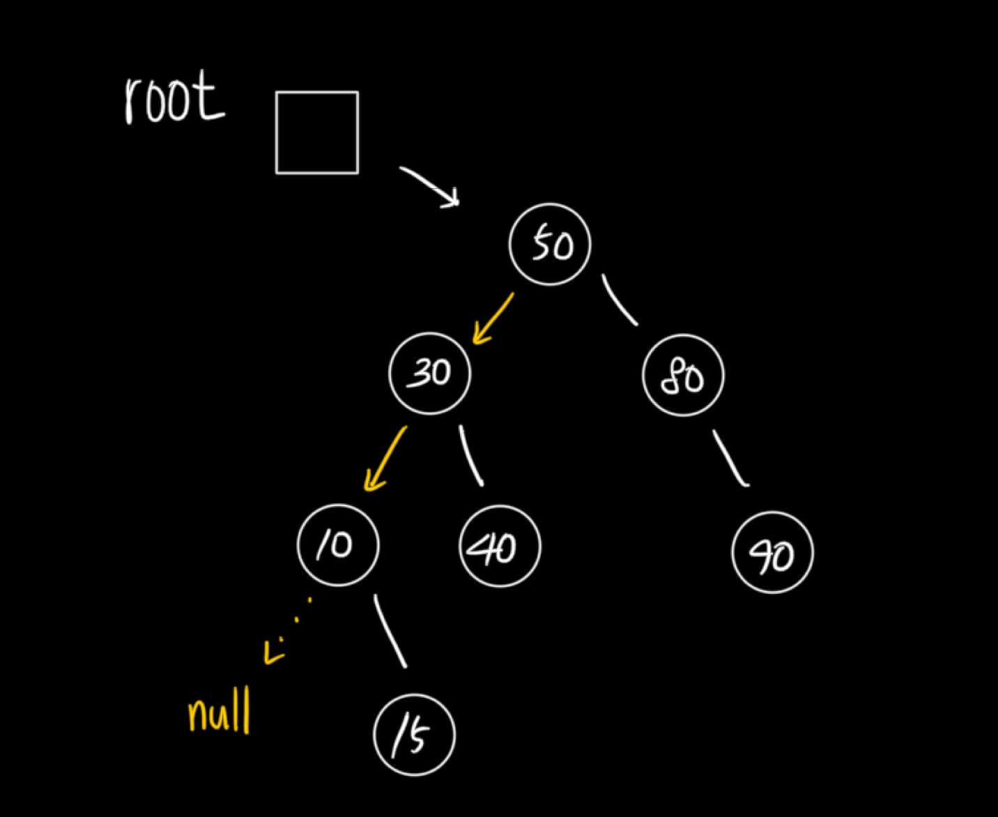 ธ๋๋ก ํ์ํ๋ฉฐ ๋ด๋ ค์ค๋ค๊ฐ n.getLeft()๊ฐ null์ด ๋๊ธฐ ๋๋ฌธ