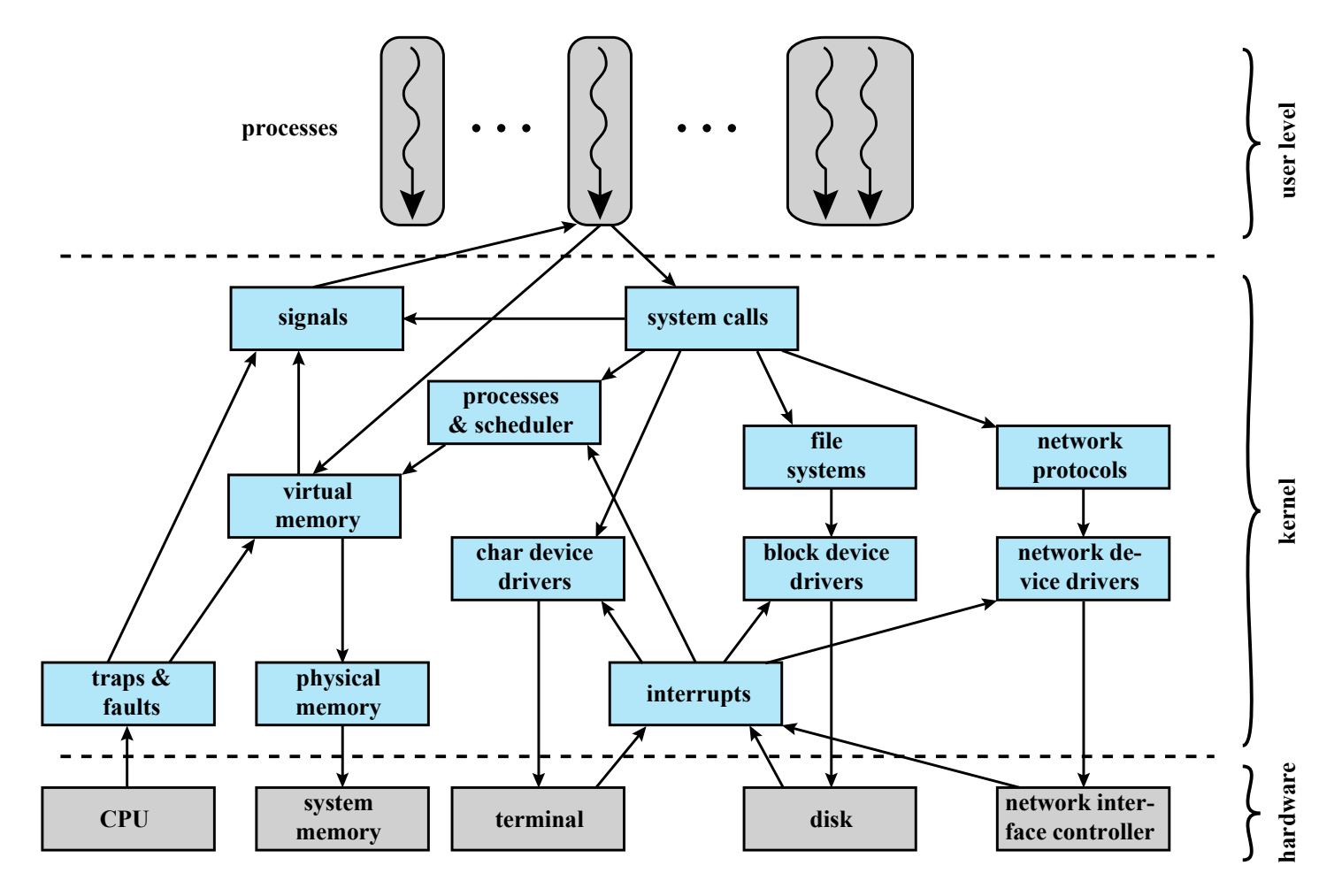 ์ฌ๊ธฐ์ ๊ผญ ์ปค๋์๋ง ์์ด์ผ ํ๋ ์ค์ํ ๊ธฐ๋ฅ๋ค์ ํ๋์จ์ด๋ฅผ ์ง์ ์ ์ดํด์ผ ํ๋ ์ฝ๋๋ ํ๋ก์ธ์ค ๋ฉ๋ชจ๋ฆฌ ์์ญ์ ๋ณดํธํ๊ฑฐ๋, ํ๋ก์ธ์ค๋ค ๊ฐ์ ๊ธฐ๋ณธ์ ์ธ ํต์ ๊ธฐ๋ฅ, ์ค์ผ์ค๋ง ๊ธฐ๋ฅ๋ค์ด ์๋ค.