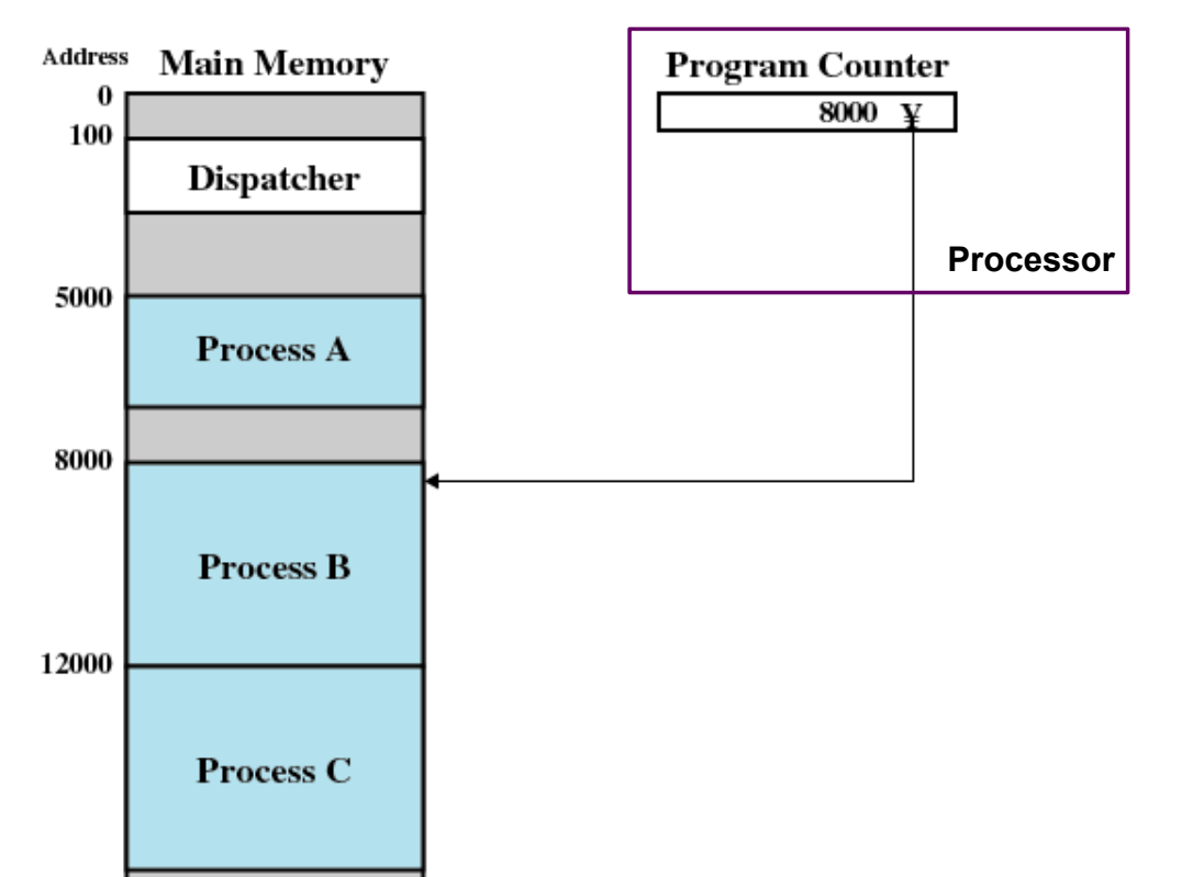 Main Memory์์ 0~5000๊น์ง๋ OS ๊ธฐ๋ฅ์ ๋ชจ์๋์ ์ปค๋์ด๊ณ , ๊ทธ ์์ _Dispatcher_๋ผ๋ ํจ์๊ฐ ์๋ค. _Dispatcher_๋ ํ๋์ ํ๋ก์ธ์ค์์ ๋ค๋ฅธ ํ๋ก์ธ์ค๋ก ํ๋ก์ธ์๋ฅผ ๋ณ๊ฒฝ(Switch)ํ๋ ์ญํ ์ ํ๋ค.