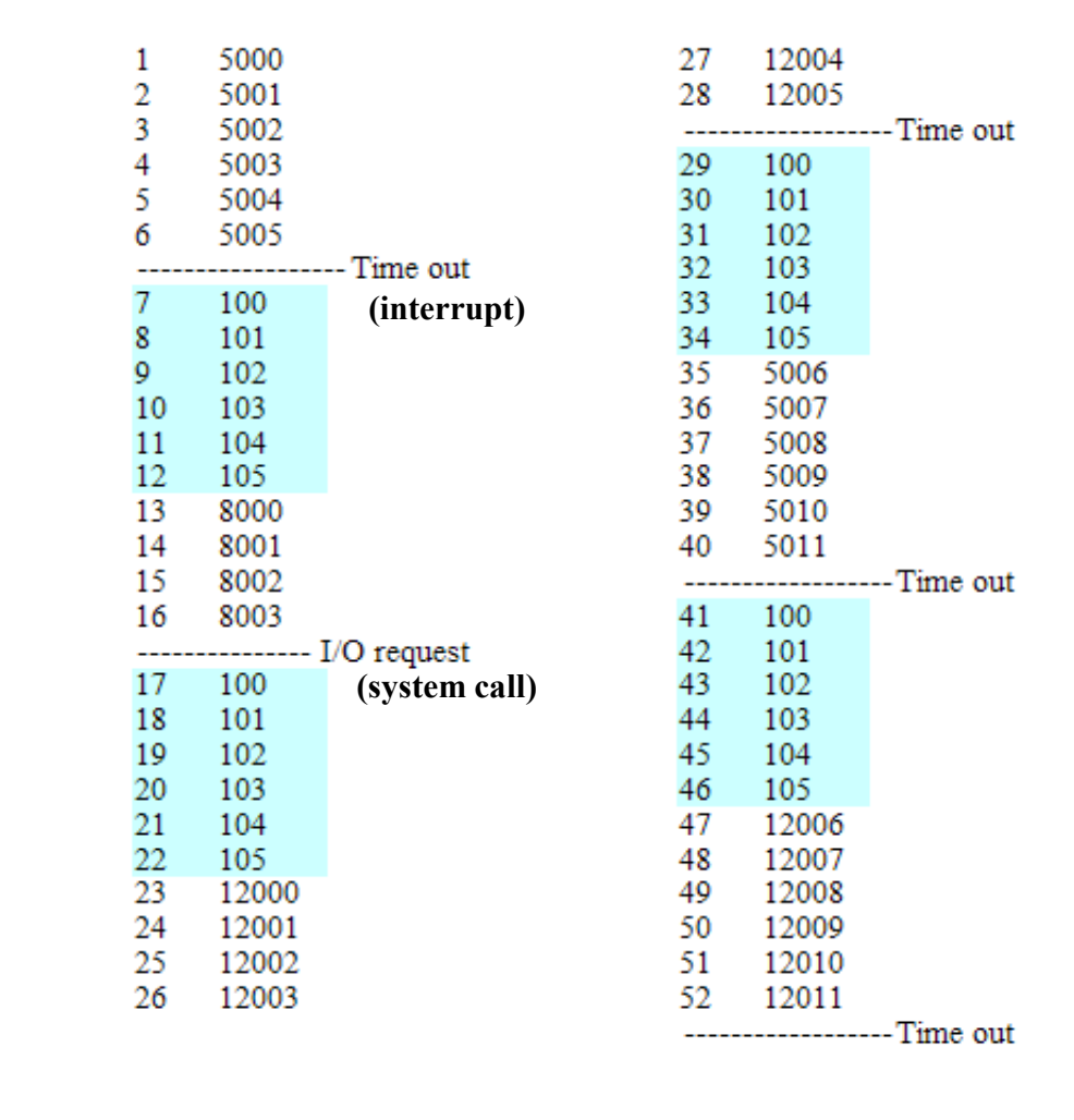 ํ๋ก์ธ์ค A๋ 5000~5012๊น์ง์ด๊ณ , ํ๋ก์ธ์ค B๋ 8000~8005, ํ๋ก์ธ์ค C๋ 12000 ~ 12011๊น์ง๋ผ๊ณ ํด๋ณด์. ์ด๋ฌํ ์ํฉ์์ ์ฐจ๋ก๋๋ก ์ฝ๋๊ฐ ์คํ๋ ๊ฒ์ด๋ค.